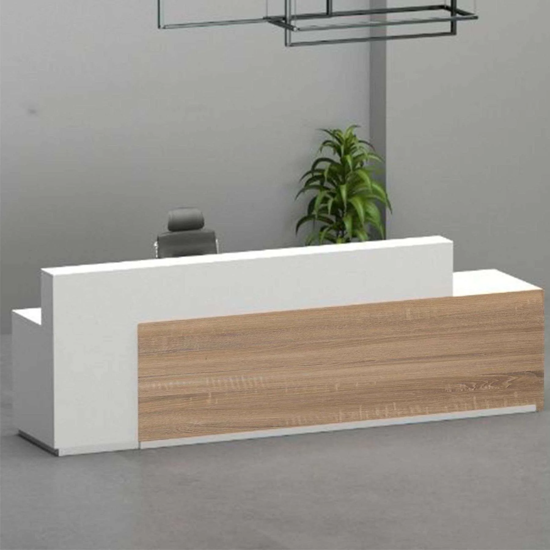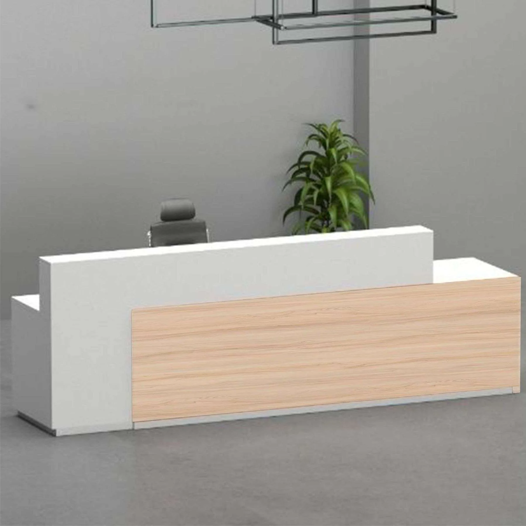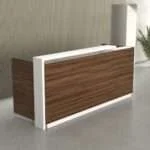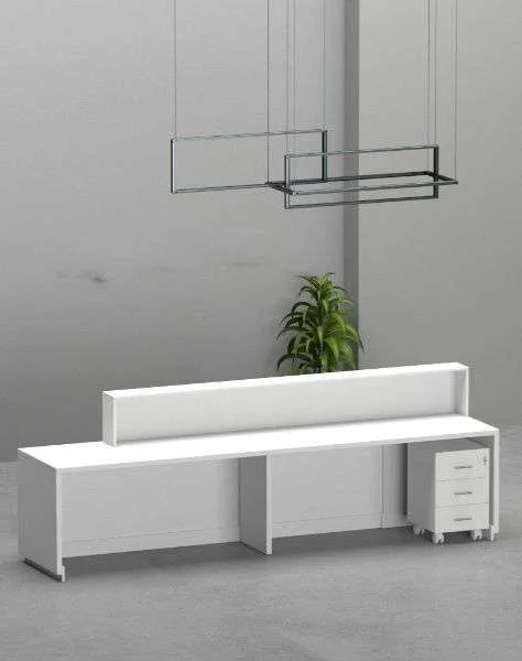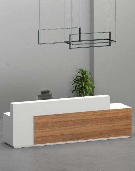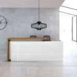 ROAA Reception Counter بتصميم عصري يجمع بين اللون الأبيض والخشب، مثالي لمساحات الاستقبال في المكاتب والعيادات مع مظهر عملي وأنيق.